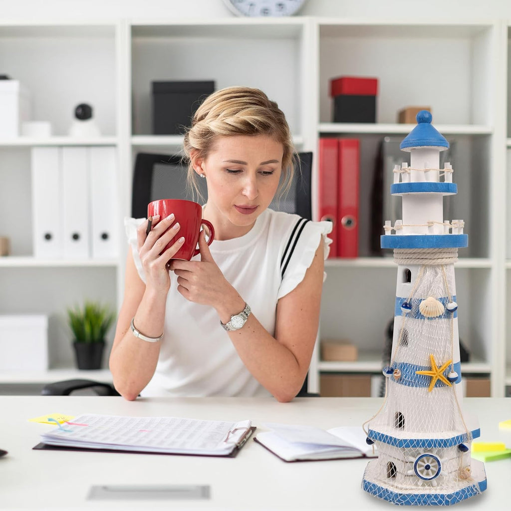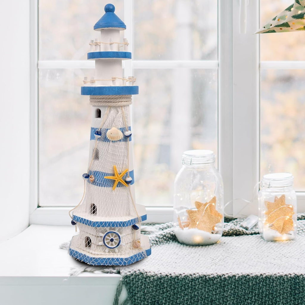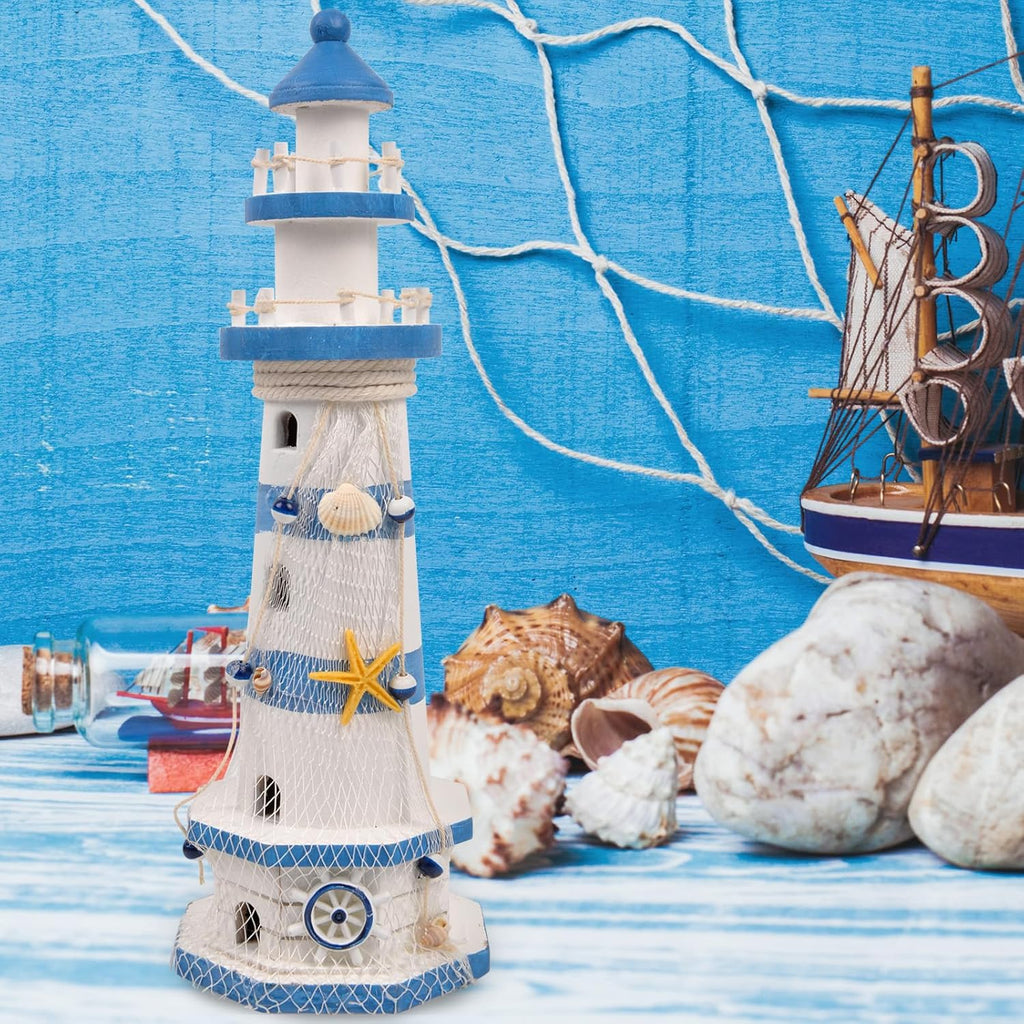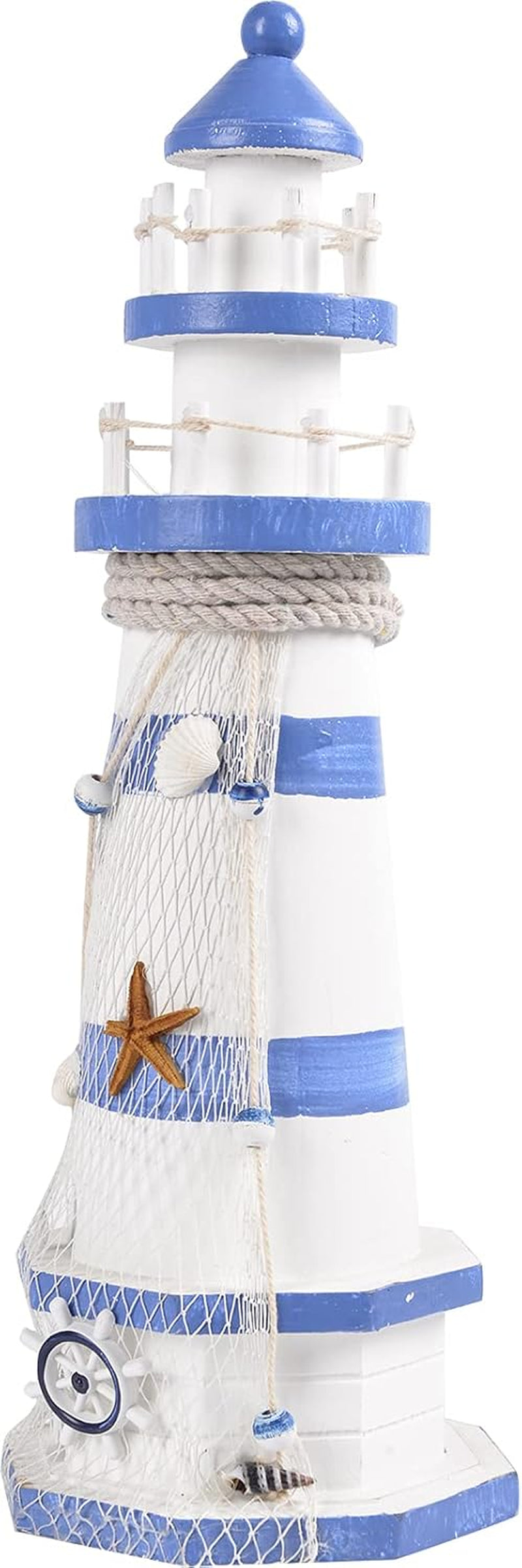Bring a coastal breeze into your home with this handcrafted Wooden Lighthouse Decor by ChezMax. Featuring a beautifully weathered blue-and-white finish and adorned with netting, starfish, shells, and rope accents, this eye-catching lighthouse is the perfect statement piece for any beach lover’s decor.